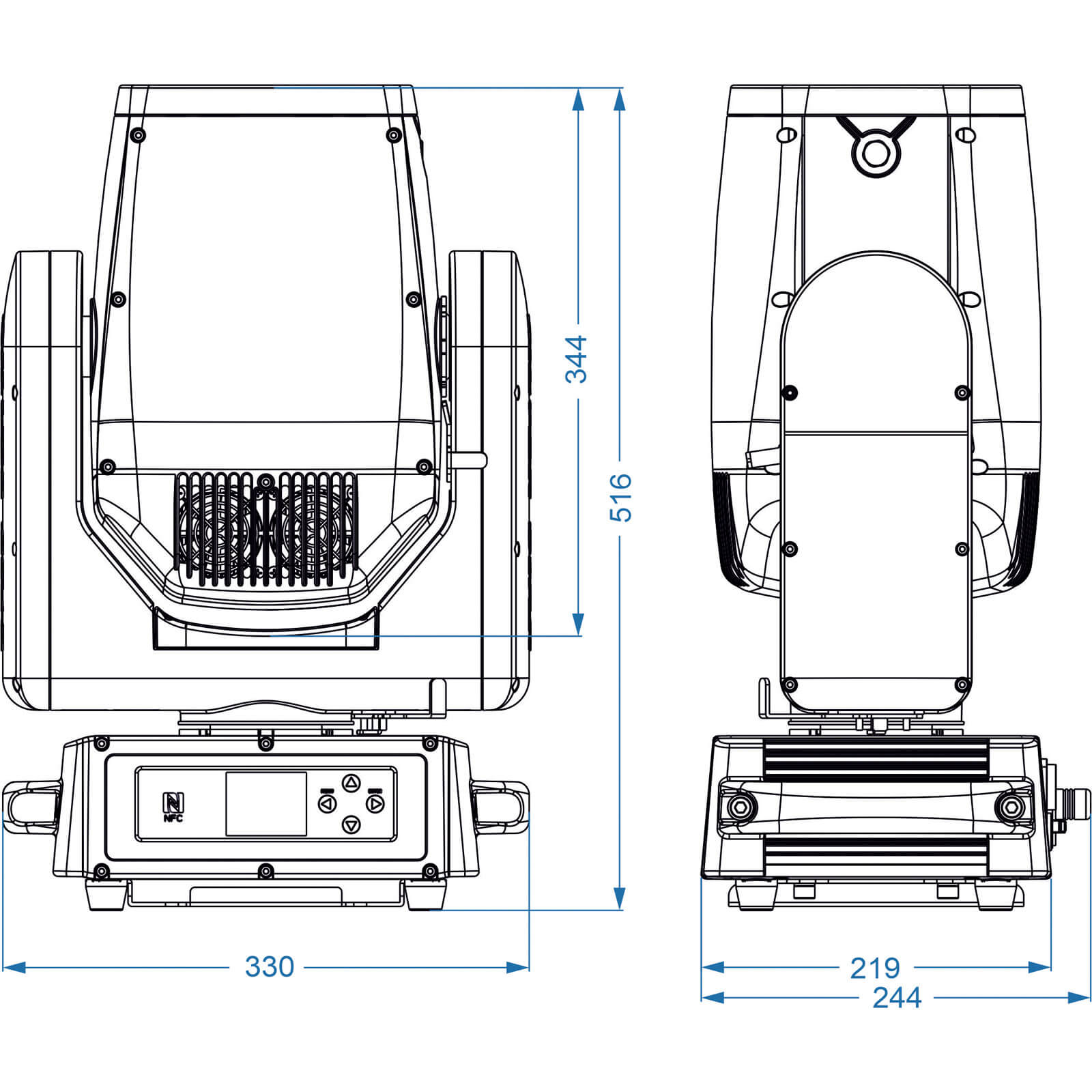 - Connectiques : entrées/sorties DMX XLR 3 points et XLR 5 points, entrées/sorties powerCON TRUE1